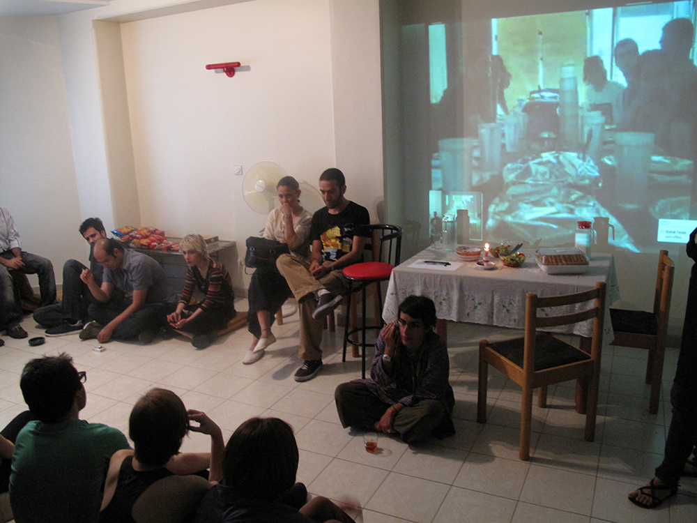 Kubideh Kitchen Skype Meal, conceived by Sohrab Kashani and Jon Rubin, is a shared meal held simultaneously in Pittsburgh and Tehran. Diners in both cities sit around long tables connected via live webcam, forming an international dinner party. Identical recipes are prepared in each location, and participants share food and conversation across a projected video link that visually extends each table into the other city.