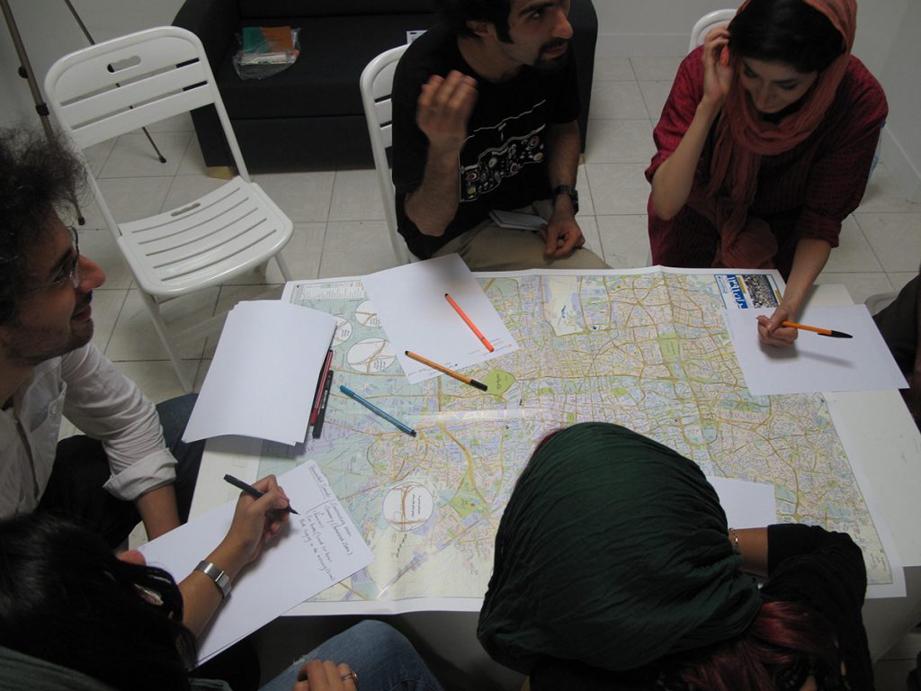 During the workshop, the group discusses theoretical and practical approaches to the interlinkage of sound and space. Participants are invited to imagine Tehran’s most characteristic sounds and to propose a sound map that guides visitors through acoustic sight-hearing rather than conventional sight-seeing. The group then takes a walk through the sounds surrounding Sazmanab, exploring these ideas through direct listening.