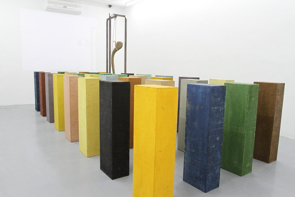 Plinths traditionally used to display sculpture function here as monochrome canvases, arranged in a grid across the space. All sculptures are absent except one. A fallen plinth disrupts the order of the abstract colour field, while a tall steel structure introduces architecture into the scene. This vertical element alters the spatial logic and opens a new dimension. With the rhythm of speech, text appears above the horizon line of the plinths, scrolling across the white walls as subtitles for an otherwise silent stage. From this position, the viewer reads the work.